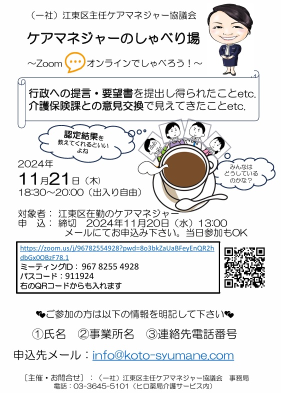 一般社団法人江東区主任ケアマネジャー協議会は、地域包括ケアシステムの構築に必要な「地域の資源」を見出し「地域のつながり」の中で江東区民の皆様が安心して住み続けることができることを目指しています。介護支援専門員、および主任介護支援専門員の倫理を確立し、かつ専門的技能の研鑽を通じて、その資質の向上に努め、併せて、地域の皆様の生活と権利の擁護し、多職種種と連携し、介護保険制度をはじめ様々な制度の適正な運営に寄与することを目的としています。
